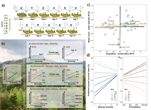 森林的结构和动态由其树木个体的生存、生长和死亡率决定。其中,树木的存活是森林维持多样性和生态系统功能的关键因素。目前普遍观察到的生物多样性对生产力的促进作用可能是由于多样性促进了树木生长或提高了存活率。然而,相比大量关于多样性与生长关系的研究,很少有关于生物多样性与树木存活之间关系的报道。