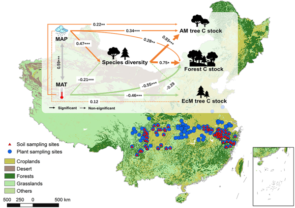 此外,该团队同期发表的另外一项在我国亚热带地区的区域尺度下关于气候和菌根类型对森林物种多样性——碳储量关系影响的研究表明,树种多样性与森林碳储量之间的关系受气候条件和共生菌根类型的共同调控。升温和干旱会增加树种多样性对碳储量的促进作用强度。而物种多样性、温度和降水与丛枝菌根树种的碳储量显著正相关,与外生菌根树种的碳储量无关或负相关。这表明应对未来气候变化,增加造林项目中的树种多样性和选择合适类型的树种将是提高人工林碳储量潜力的重要策略。该研究面向我国“双碳”目标需求,为未来森林恢复和碳补偿措施提供了科学支撑。