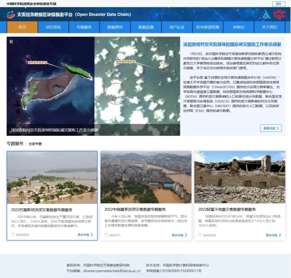 目前,该平台已为联合国亚洲及太平洋经济社会委员会、联合国训练研究所、科技部和中科院等开展的汤加、孟加拉国、巴西、阿富汗、巴基斯坦的地震、洪涝、火山爆发等重大灾害应急响应提供了有力数据和技术支撑,取得了良好社会效益。未来,该平台将继续与更多国内外减灾机制开展合作,不断推动区块链技术在防灾减灾领域的深度融合。