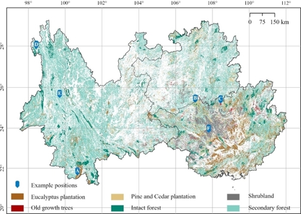 该模型可以对高分辨率遥感影像进行复杂森林分类和分割,研究区包括云南、广西、贵州三省,总体精度达到89.96%。其中,51%的研究区域被森林覆盖。其中65.83%的森林是次生林,10.17%属于桉树人工林,5.19%属于杉木和马尾松,居民点附近的破碎化残存老林仅占0.02%,单一人工林覆盖了15%的研究区域,特别是广西有29.85%的森林均是单一人工林。