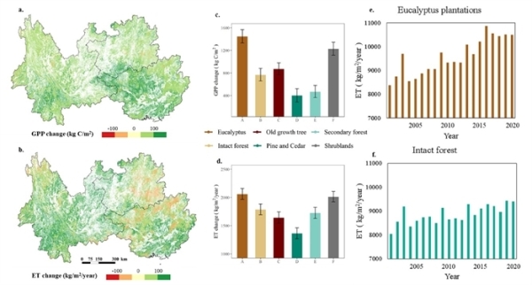 研究进一步发现,单一种植人工林可以较快提高区域生态系统生产力,但同时也会影响区域水平衡,尤其是桉树人工林,其主要分布在广西南部和贵州北部。对比2001-2020年桉树人工林与其他森林类型的总初级生产力和蒸散发变化,研究发现桉树人工林的总初级生产和蒸散发增长均高于其他森林类型,其中桉树的蒸散发在2001-2020年的增长是原始森林的1.5倍,是次生林的1.2倍。而天然老林的生产力和蒸散发则变化相对稳定,次生林的生产力变化与天然老林相近,但蒸散发的增长是天然老林的1.3倍。