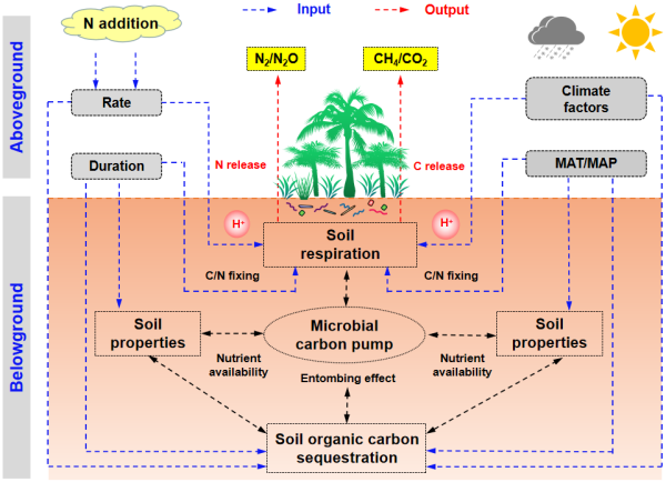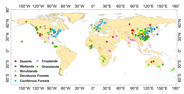 近期,中国科学院地球环境研究所王云强团队副研究员杨阳联合加拿大阿尔伯塔大学、中科院西北生态环境资源研究院、西北农林科技大学等多家高校和科研单位,建立了氮添加和环境气候因子之间的复杂作用机制框架。在此基础上,从全球261篇文章中收集了1413对数据进行整合分析,研究氮添加对不同陆地生态系统类型土壤呼吸及其温度敏感性的影响。
