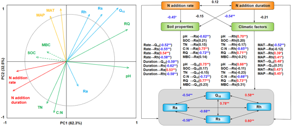 土壤呼吸(Rs)是陆地生态系统排放到大气二氧化碳(CO2)的最大通量,在全球碳循环中发挥重要作用。土壤呼吸一般由两部分组成,一部分是异养呼吸(Rh),为土壤微生物分解有机物时所释放的CO2;另一部分是自养呼吸(Ra),主要包括活体根系呼吸所释放的CO2。在全球范围内,土壤呼吸通常随温度增加而增加,其响应强度用土壤呼吸温度敏感性(Q10)表示,即温度每增加10℃土壤呼吸所增加的倍数,能够反映出碳-气候反馈机制。因此,了解全球尺度下土壤呼吸及其温度敏感性对氮添加的响应,有助于提高预测土壤碳动态及其对气候变化反馈能力。