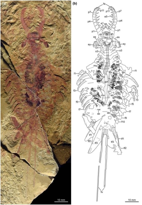 近日,南京古生物所朱茂炎团队副研究员曾晗、研究员赵方臣等,对包括这块完整的奇虾类标本在内的相关化石进行精细的形态解剖研究。研究发现,这块经典的奇虾类化石标本在前附肢形态、桨状叶数量、尾扇组成等特征上均不同于其他已命名的奇虾类属种,应属于一个新属新种。该研究以这块化石标本为正模式标本,将其命名为帽天山开拓虾(Innovatiocaris maotianshanensis),以纪念陈均远对澄江动物群与寒武纪大爆发研究的贡献。相关研究成果在线发表在《地质学会会刊》(Journal of theGeological Society)上。