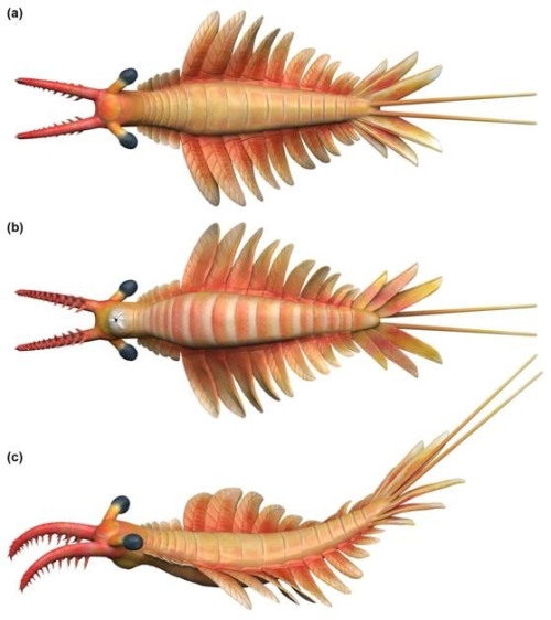 作为最早称霸海洋的大型掠食动物和顶级捕食者,奇虾类动物(anomalocarids)在寒武纪早期的出现,标志着寒武纪大爆发时期金字塔式食物链的存在以及复杂生态系统的建立。奇虾类的身体造型怪异,最大体长推测可超过2米。它们的头部由一双视觉良好的带柄眼、一对多刺的掠食型前附肢以及一只辐射状的口器等器官构成,表现出在捕食上的高度特化;流线型躯干上长有一系列成对的桨状叶和鳃片,分别用于游泳和呼吸;尾部具有一至三对桨状叶组成的尾扇,部分物种还具有细长的尾叉,在运动中可起到转向和平衡的作用。