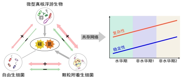 在气候变化和富营养化加剧的背景下,有害蓝藻水华在全球的发生频率和强度呈增加趋势,严重威胁着水生生态系统服务功能。水体微型真核浮游生物和浮游细菌通过物质循环、能量流动和信息交换,在微食物网中形成复杂的互作关系(如捕食、共生和寄生),进而维持生态系统结构和功能的稳定。前期研究发现水库水华蓝藻的生消过程与稀有微型真核浮游生物密切相关,强调了稀有种在维持水库生态系统稳定性中的作用;蓝藻水华会促进浮游细菌从自由生向附着生的生活方式转化。但对于跨域微生物互作关系如何响应蓝藻水华,蓝藻水华是否通过水体理化因子改变跨域微生物互作关系等问题的研究和认知还十分有限。