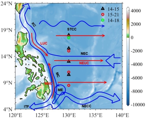 作为北太平洋西边界流系统的源头,北赤道流(NEC)及其下方的北赤道潜流(NEUC)在太平洋的水体平衡和热量收支中发挥着重要作用。胡敦欣团队基于近年来在西太平洋主流系130°E断面开展的潜标阵列观测,发现NEUC表现出和NEC近似同步的年际变化,上层的西向NEC增强时,下层的东向NEUC减弱,NEUC在8.5°N的分支在厄尔尼诺成熟期开始增强,在厄尔尼诺衰退期达到最强。