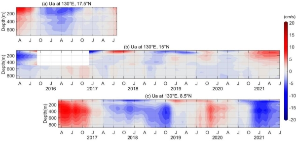 NEC速度的年际变异信号存在随纬度增加而滞后的现象,15°N的信号比8.5°N滞后一年左右。科研团队结合卫星高度计数据和约化重力模式实验,认为NEC年际变化主要受中太平洋风场强迫产生的西传斜压Rossby波控制,Rossby波在不同纬度的传播速度解释了年际信号的经向滞后现象。垂直模态分析表明,北部NEC/NEUC速度的年际变化以第一斜压模垂直结构的表层强化信号为主,而南部则以第一和第二斜压模共同主导的次表层强化信号为主。海洋对大尺度风场低频信号的不同低阶斜压模响应解释了NEC/NEUC速度年际变化垂向结构的经向差异。该研究对进一步厘清北赤道潜流的年际变化规律及其与北赤道流的关系具有重要意义。