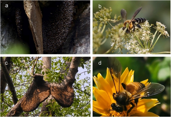 野外黑大蜜蜂和大蜜蜂:(a)黑大蜜蜂在悬崖上筑巢,(b)黑大蜜蜂在传粉,(c)大蜜蜂在树干上筑巢,(d)大蜜蜂在传粉。