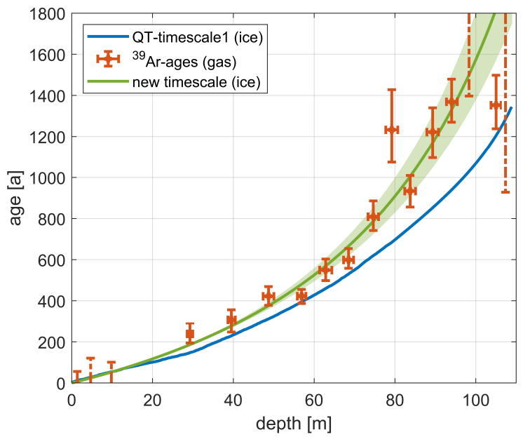 图4. 冰芯深度与年代的关系。绿色部分为基于39Ar结果的新年代标尺。