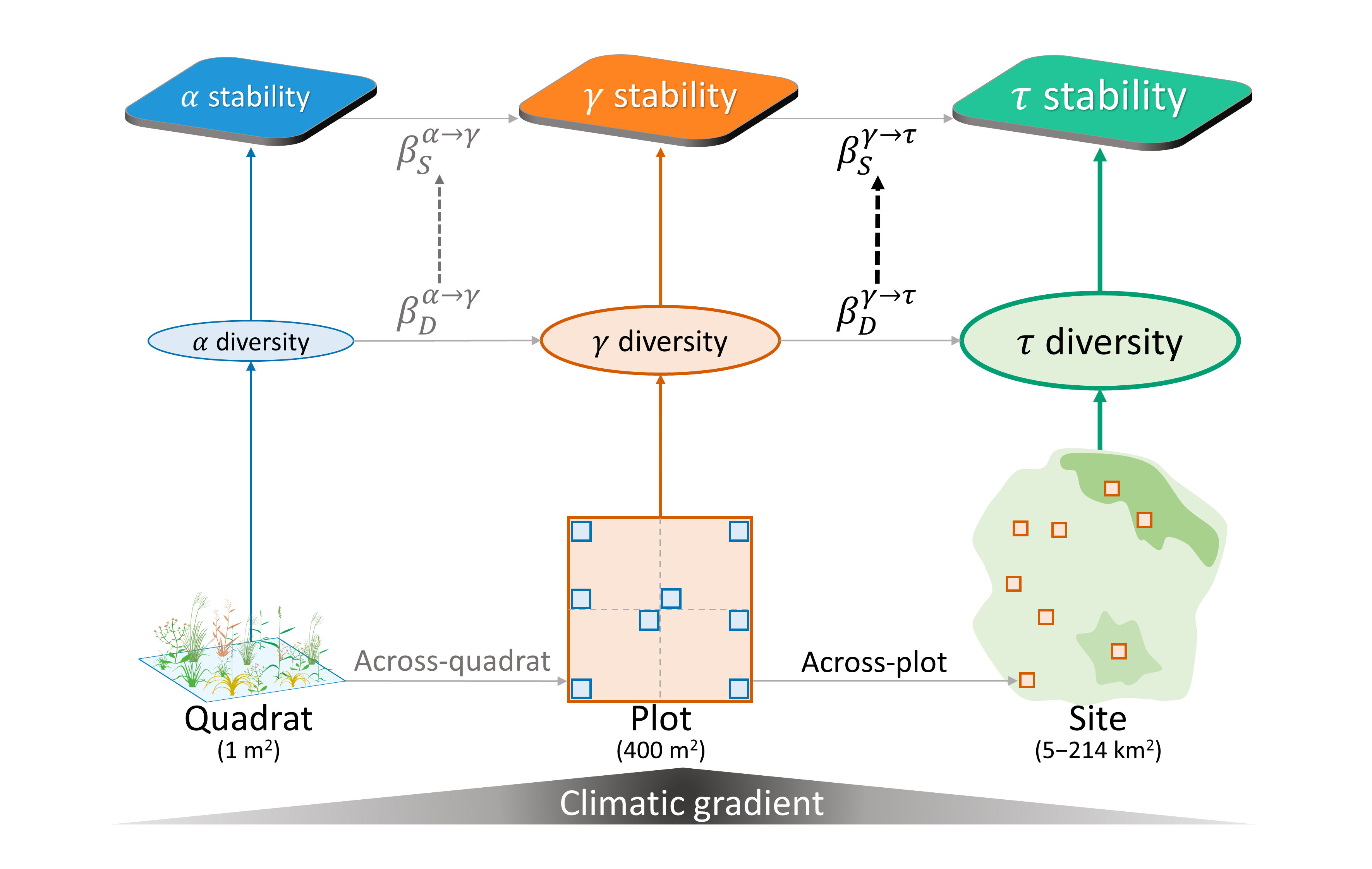 自然生态系统为人类社会提供了多种功能和服务。在全球变化背景下,维持生态系统的稳定性成为可持续发展的关键目标之一。很多研究表明,多样性越高的生态系统具有更大的稳定性。虽然“多样性-稳定性”理论自1990年代以来日趋成熟,但以往研究主要关注小尺度实验群落,关于这一理论能否扩展至大尺度自然群落仍不清楚。为了理解这一问题,北京大学城市与环境学院研究员王少鹏的研究组自2014年以来开展了一系列理论工作,提出并发展了多尺度稳定性理论框架,基于这一理论框架预测局域群落间的物种组成差异(即β多样性)可促进区域尺度生态系统的稳定性。针对这一理论框架,近期多项研究利用单个站点的植物群落实验数据做了检验,但跨区域的大尺度经验证据依然缺乏。