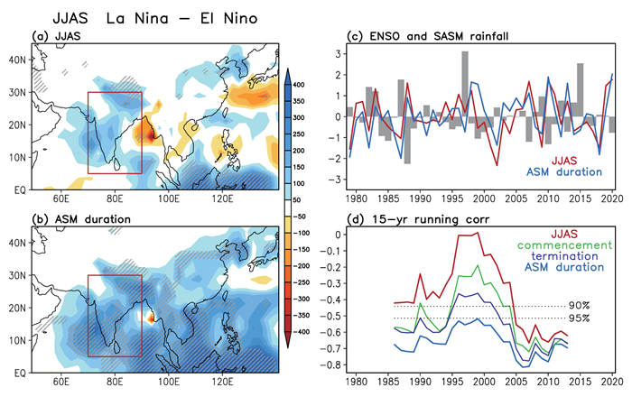 图1. 夏季ENSO合成的(a)JJAS降水,(b)夏季风降水的空间分布。这里的夏季风降水是指从夏季风建立到撤退这段时间内的总降水量。(c)夏季的Nino 3指数,南亚地区的JJAS降水和夏季风降水的标准化时间序列。(d) 夏季的Nino 3指数和南亚地区降水的15年滑动相关,红线和蓝线分别是JJAS降水和夏季风降水。