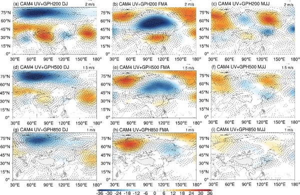 模拟的200 hPa(abc)、500 hPa(def)和850 hPa(ghi)的平均风向量DJ(m/s)(左),FMA(中)和MJJ(右),背景颜色代表位势高度场的空间分布变化。