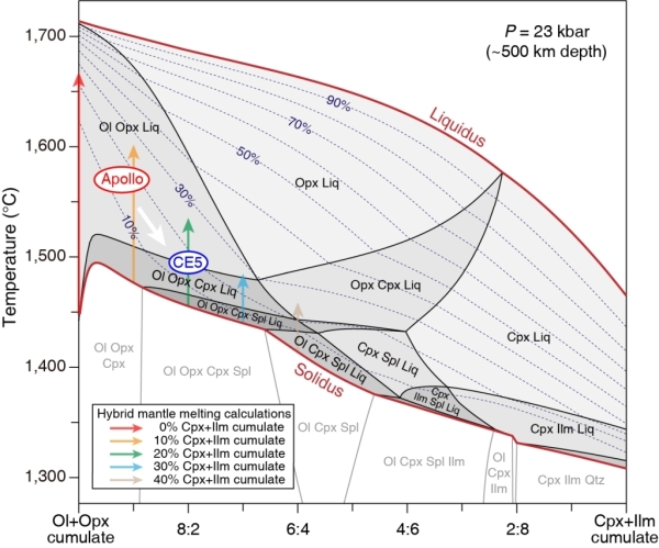 图4.阿波罗和嫦娥五号玄武岩初始岩浆多相饱和温压计算结果