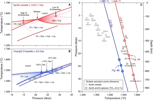 基于这一研究思路,中国科学院地质与地球物理研究所副研究员苏斌、研究员陈意和工程师原江燕,联合研究员杨蔚、R. N. Mitchell,副研究员王浩、田恒次,中科院院士李献华、吴福元,以及南京大学教授惠鹤九,选取27颗代表性嫦娥五号玄武岩岩屑(粒径大、内部矿物颗粒多、分布均匀),采用新研发的扫描电镜能谱定量扫描技术分析了岩屑的全岩主量成分,结合一系列岩浆分离结晶模拟和热力学模拟计算,恢复了嫦娥五号玄武岩和阿波罗低钛玄武岩的初始岩浆成分(图1、2),限定了不同时期月球火山岩的幔部源区组成(图3),获得了它们熔融的温压条件(图4),并取得如下认识:与古老的阿波罗低钛玄武岩相比,年轻的嫦娥五号玄武岩的初始岩浆含有更高CaO和TiO2以及更低MgO(图2);与阿波罗低钛玄武岩相比,嫦娥五号玄武岩的源区含有更高的(~20%)岩浆洋晚期形成的单斜辉石-钛铁矿堆晶体,而它们的加入会显著降低月幔的熔点,诱发年轻火山的形成(图3);嫦娥五号玄武岩与阿波罗玄武岩起源深度大致相当,但嫦娥五号玄武岩的形成温度更低,指示月球内部温度从38-31亿年前到20亿年前仅降低了~80 ℃(图4)。