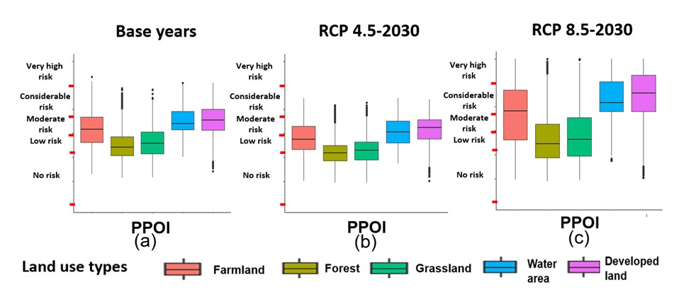 本研究显示出土地利用、人口迁移和气候变化在不同RCP情景下如何加剧或缓解PM2.5污染生态风险,并以闽三角城市群为案例,推演出未来潜在的高风险区域。通过高分辨率PM2.5污染模拟和建立PPOI指数,本研究首次评估了PM2.5污染生态风险的全覆盖高分辨率时空变化,该PM2.5污染生态风险框架可广泛用于其他区域,对持续改善空气质量、保障大气污染生态风险全区域分级管理和多场景决策分析工作具有重要指导意义,也为践行习近平生态文明思想提供科学助力,以不断满足人民日益增长的优美生态环境需要。