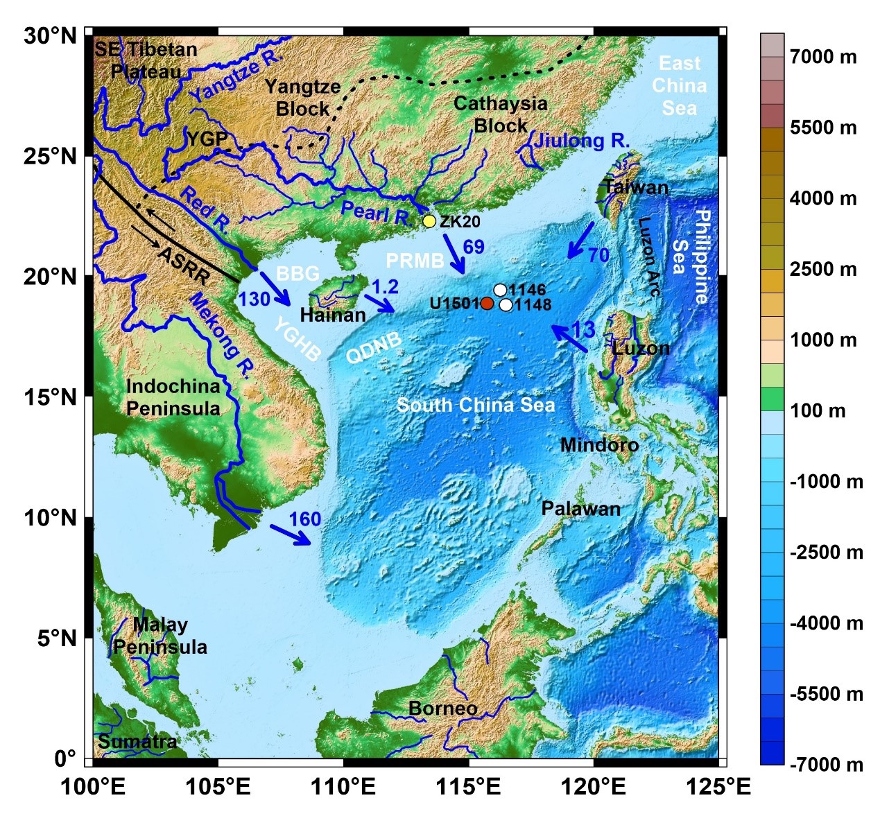 约5500万年前印度次大陆和欧亚大陆发生碰撞,导致了喜马拉雅-青藏高原此后的阶段性隆升,东亚地形格局和气候模式也随之发生了剧烈变化,主要分别表现为从西低东高转变为西高东低和从行星风系转变为季风风系,在构造变形和气候变化的共同影响下,东亚水系逐渐形成,同时塑造了陆上地貌并控制了陆源物质向边缘海的输送。现代珠江,发源于云贵高原,流经华南地块(包括华夏地块和扬子地块),自广州汇入南海,是我国境内仅次于长江、黄河的第三长河。前人对珠江的演化历史开展了大量研究,揭示出珠江不同于东亚其他大河,它最初形成于华南地块东南沿岸,随后逐渐向西溯源侵蚀,其形成发育过程可能与华南地块构造演化密切相关,然而,由于以往研究材料和分析方法的限制,珠江流域在长时间尺度上的演化细节仍不清楚,特别是珠江流域何时以及如何形成现代规模没有明确认识。