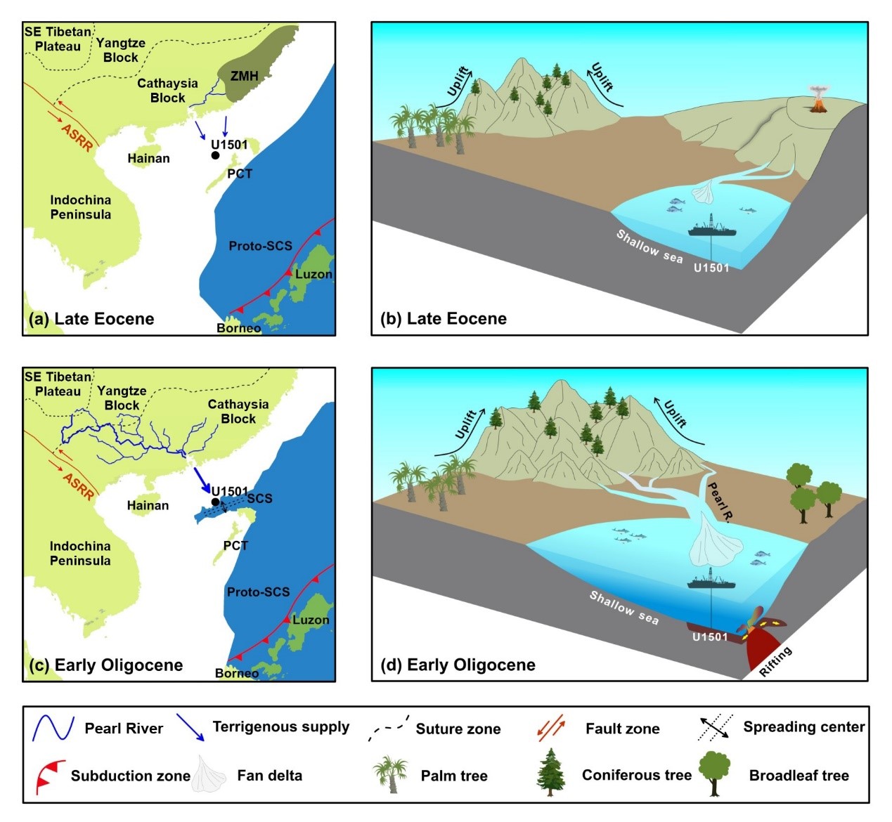 研究人员通过南海北部的陆源碎屑沉积记录约束了过去3500万年以来研究区沉积物物源演化,揭示类似现代规模的珠江流域形成于约三千万年前,源于青藏高原东南部隆升和中国东部地形倒转。