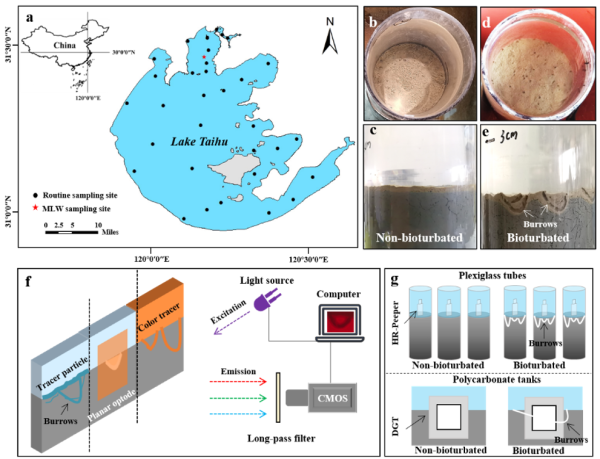 图1 太湖大型底栖动物采样点(a),生物扰动的沉积物(bcde),荧光示踪技术和平面光极成像示意图(f),HR-Peeper和DGT采样示意图(g)