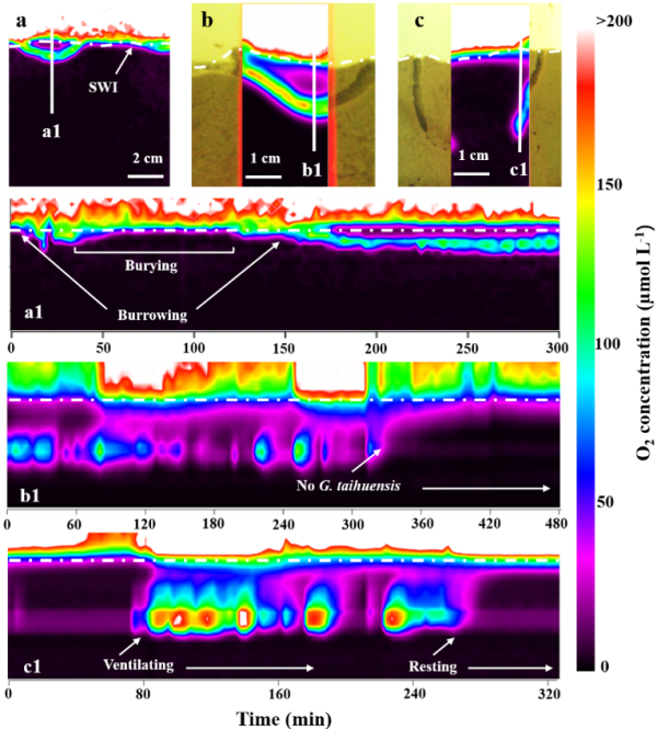 研究发现,2007-2020年太湖底栖动物的总密度下降了93%,其中优势种霍甫水丝蚓、摇蚊幼虫以及钩虾的密度下降明显,而其他优势种河蚬和铜锈环棱螺的密度呈现波动变化(图2)。通过平面光极获取的高时空分辨率氧气二维变化可知,太湖钩虾通过生物灌溉增加了沉积物中氧气的可利用性和渗透深度,同时钩虾的间歇性通风活动导致洞穴及其周围沉积物中产生高度的氧化还原震荡(图3)。其他优势种,如霍甫水丝蚓和摇蚊幼虫扰动,也可以向沉积物中输送氧气,然而河蚬和铜锈环棱螺扰动会消耗表层沉积物中的氧气。