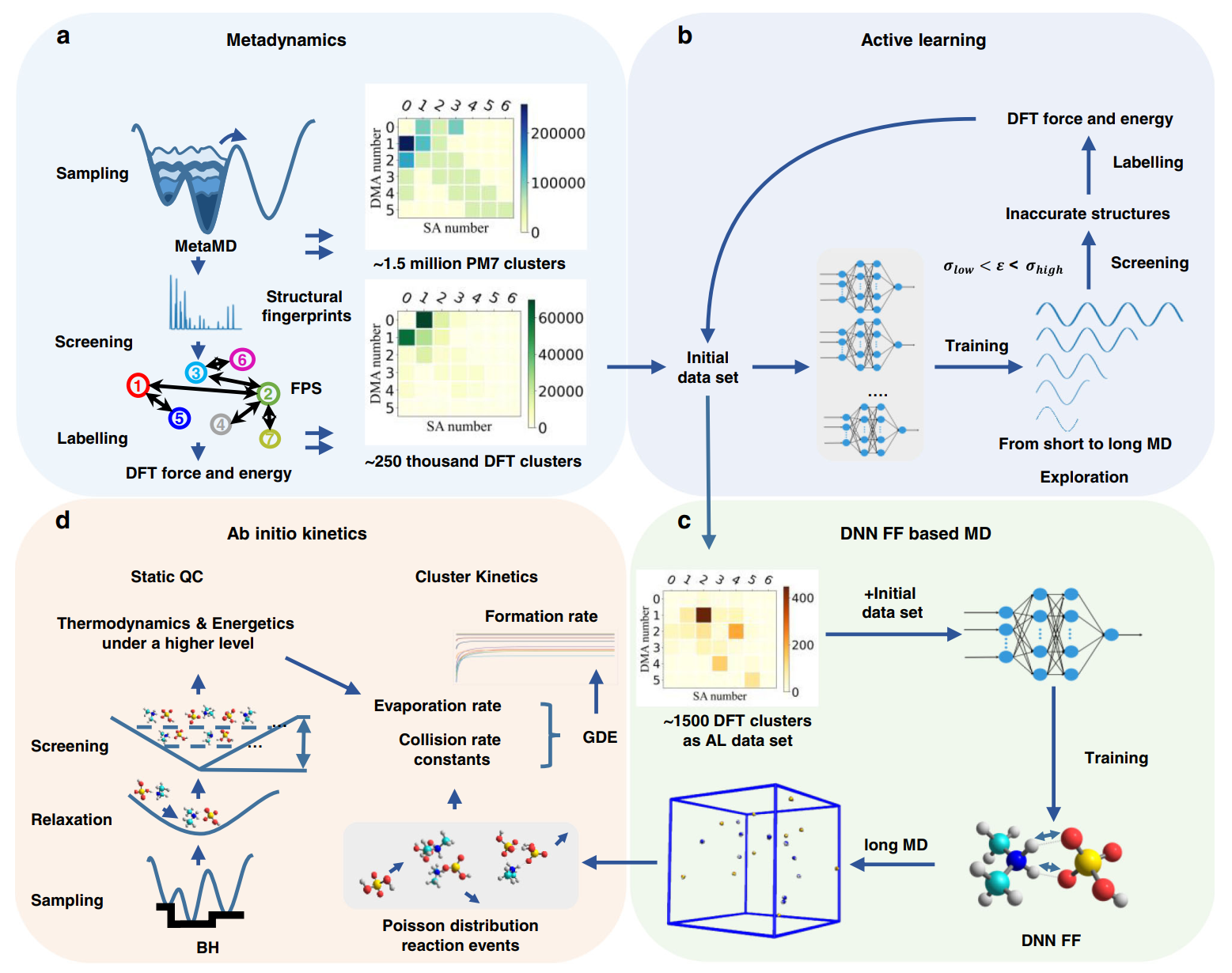 由于大气气溶胶成核的稀有事件性质,现有分子力场的非反应性和从头算的高计算成本阻碍了对大气气溶胶成核动力学的理解。因为非共价氢键桥接的成核分子团簇具有宽尺寸范围和势能面高维特性,开发用于成核分子团簇的反应性分子力场极具挑战。在这里,研究团队提出了一个普适性的工作流。通过训练基于深度神经网络的准确反应性分子力场,并进一步将基于深度神经网络-分子力场的分子动力学所得到的碰撞速率系数与团簇动力学模型进行耦合。研究发现,之前文献报道的大气酸碱成核速率往往被严重低估,尤其是在中国复合污染条件下。该工作为大气气溶胶成核模拟最终走向全从头算指明了研究方向。