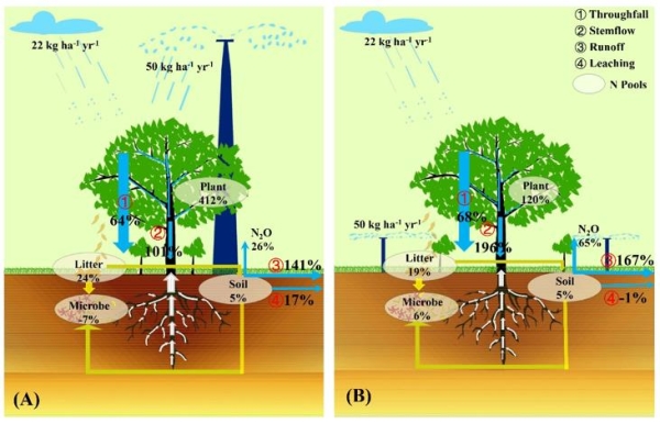 林冠(A)和林下(B)氮添加50 kg ha-1 yr-1对南亚热带季风常绿阔叶林氮收支的影响。图中百分比表示相比对照变化的比例,正值表示增加,负值表示降低。