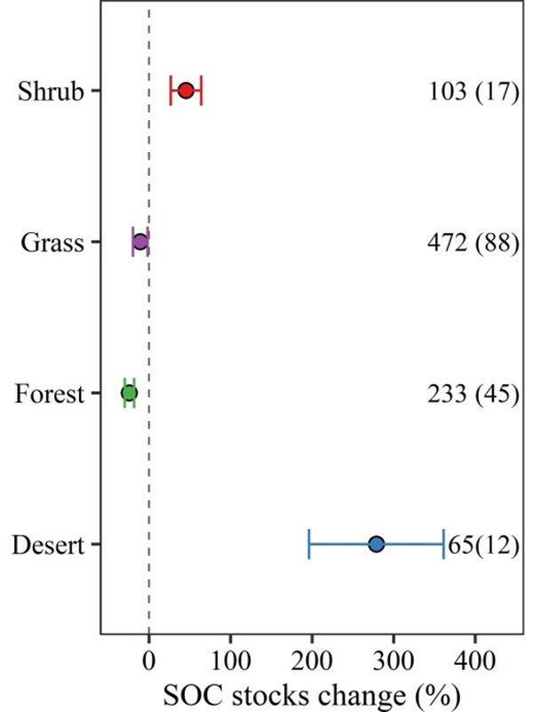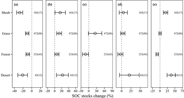 图1. 自然生态系统开垦为农田对土壤有机碳储量的影响(95%置信区间)