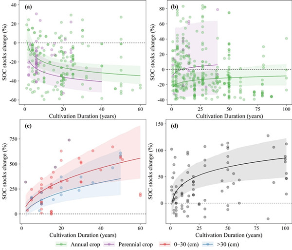 为保障日益增长人口的粮食安全,不断扩张的农业活动对全球土壤有机碳储量产生了深远影响。然而,自然生态系统开垦为耕地对土壤有机碳的影响仍然存在较大的不确定性,特别是占全球陆地总面积45.36%的旱区。这不利于提高对区域和国家碳动态的认知,也削弱了积极的农业措施应对气候变化的可靠性。因此,提高土地开垦对区域土壤有机碳储量的认知具有重要意义。