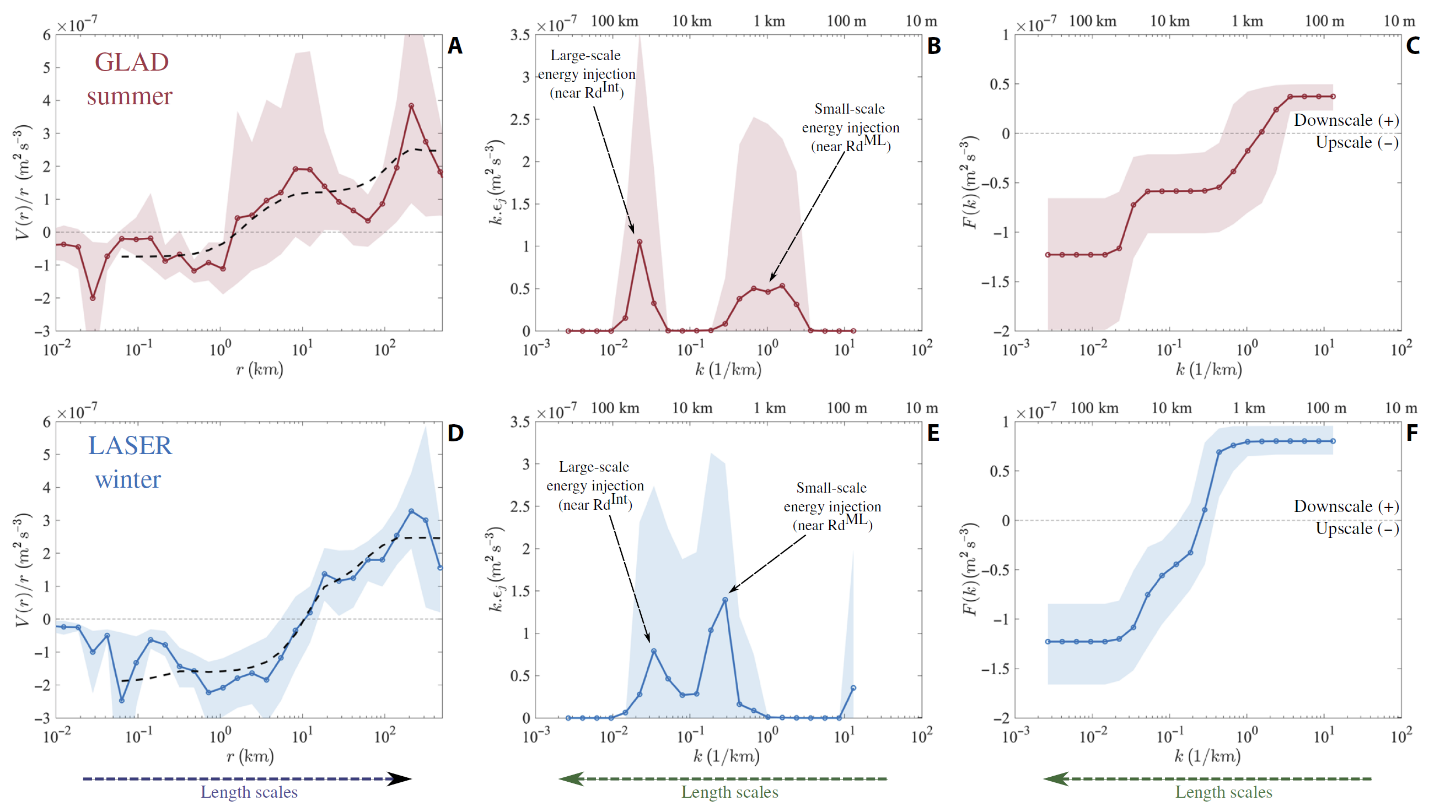 图2. 基于三阶结构函数获得的墨西哥湾夏天(上图)和冬天(下图)的能量跨尺度传输。A和D是三阶结构函数;B和E是能量注入的尺度和强度;C和F是能量跨尺度传输强度,其中能量向大尺度和小尺度的传输分别对应负号和正号