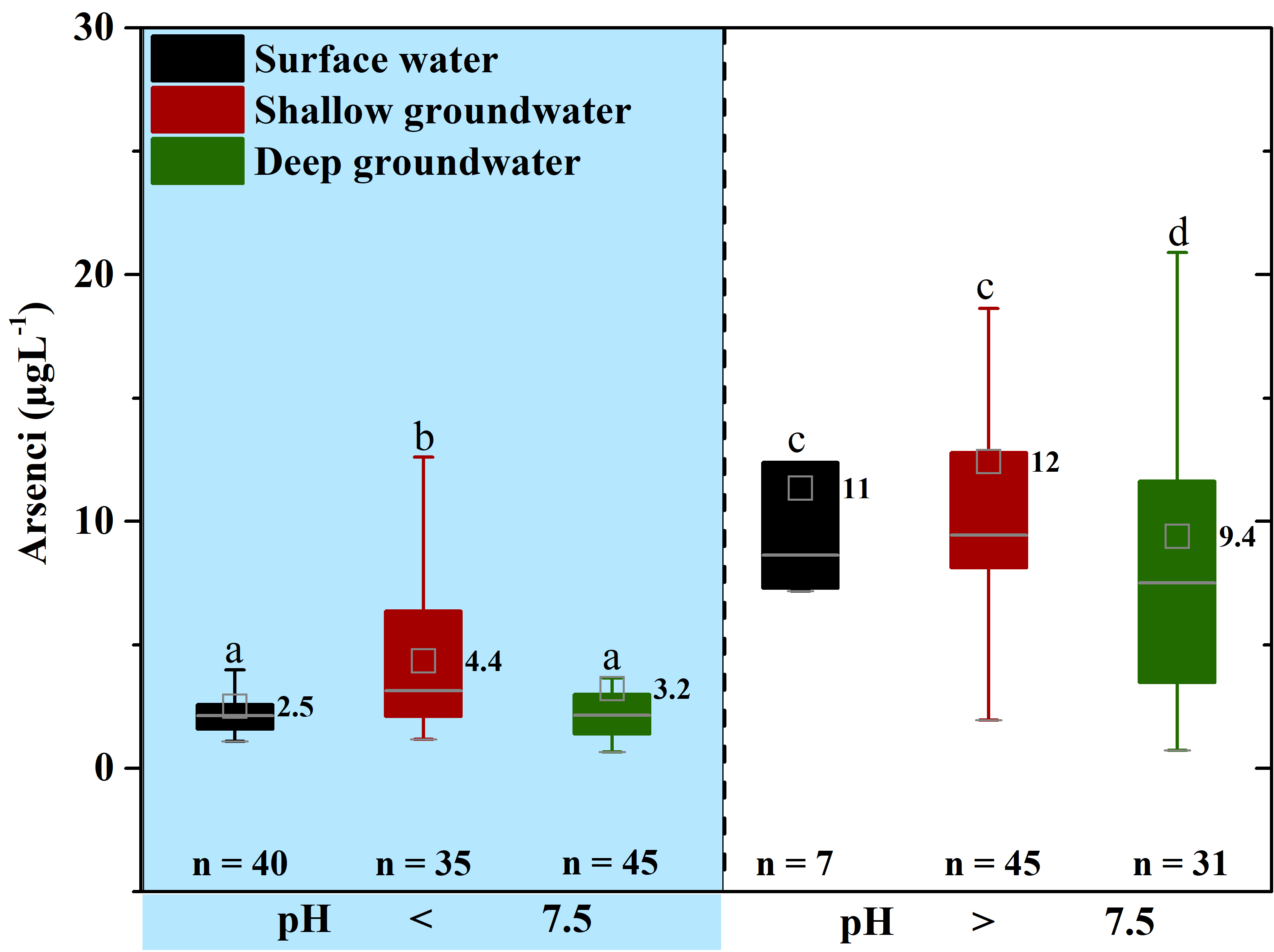 图4 不同pH下研究区不同水体的砷浓度