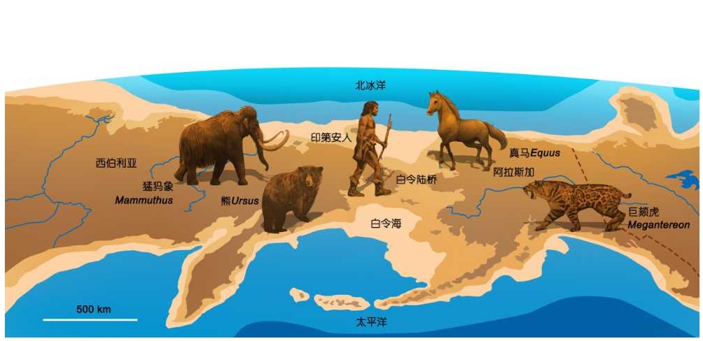图2. 海平面下降时的白令陆桥以及哺乳动物和人类的穿越迁徙