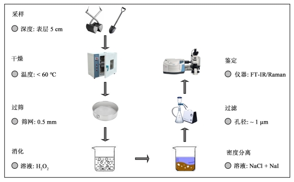 数据荟萃路径深化了已有监测海湾沉积物微塑料分布、组成和风险的科学认知。然而,微塑料监测方法的差异性和风险评价的复杂性,给全球视角下海湾沉积物微塑料污染的比较研究带来相应的不确定性。例如,不同数据来源所选用的采样、预处理和鉴定技术存在差异,是海湾沉积物微塑料数据共享的瓶颈。相对地,论文整合分析了海湾沉积物已有的微塑料监测方法,在展望中提出包括样品采集、干燥、分离、消解、过滤和鉴定等环节的监测流程(图4),以期促进全球尺度下海湾沉积物微塑料数据的有效共享。就微塑料风险评价的复杂性而言,数据的有限性导致海湾沉积物微塑料的安全阈值尚未明确且复合污染效应仍然难以量化,这意味着海湾微塑料的生态风险亟需更多的关联数据加以验证。为此,有必要以微塑料为核心构建“环境因子-多种污染物-生物体”一体化监测指标体系,以支撑微塑料风险评价体系的迭代与完善。