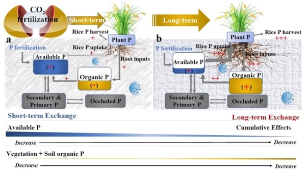 二氧化碳(CO2)是植物进行光合作用制造有机物质的重要原料,大气中CO2浓度升高(eCO2)会导致植物的光合作用增强,提高生产率,这就是CO2的施肥效应。长期以来,eCO2的施肥效应一直被视为未来全球粮食安全有效保障之一。然而,CO2施肥效应容易受土壤养分胁迫影响。例如前人发现长期高CO2条件下自然生态系统中土壤氮(N)发生明显下降,导致eCO2对植物的施肥效应逐渐下降甚至消失。目前,eCO2对土壤磷循环的研究相对较少,且在不同的生态系统、培养条件和时间尺度上的结论不一。自然生态系统中更多是增加或维持土壤磷的有效性;农田生态系统零星研究发现,eCO2会减少旱地土壤磷的有效性以及有机磷含量。这些已有研究基本基于中短期试验,目前尚缺少十年以上长时间尺度的FACE(Free-Air CO2 Enrichment)试验,限制了未来陆地生态系统磷循环的精准预测。