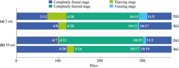 中国科学院西北生态环境资源研究院科研团队在青藏高原东北缘疏勒河源多年冻土区极重度退化草地开展相关研究,首次通过对比分析2017-2020年极重度退化草地(DG)和人工建植草地(RG)的活动层厚度、土壤冻融过程和团聚体特性,发现:0-10 cm深度土壤完全冻结期开始时间提前17天,完全融化期开始时间延迟18天(图1)且完全冻结天数显著增加47天,而2 cm深度冻融日显著减少且冻融强度减弱;活动层厚度明显减薄(图2);0-20 cm深度土壤团聚体平均重量直径显著增大且抗侵蚀能力明显增强(图3)。由此表明,极重度退化草地的植被重建措施可明显提升多年冻土稳定性。该研究可为高原极重度退化草地的多年冻土保育技术研发提供数据支撑和科技示范,并有助于实现气候变暖背景下高寒草地生态系统服务功能的稳定和提升。