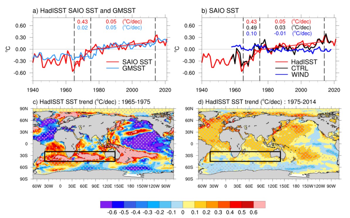 图1(a)SAIO SST和全球平均海表温度(GMSST)的时间序列。(b)观测和LICOM3的CTRL和WIND实验得到的SAIO SST的时间序列。(c-d)1965-1975年和1975-2014年期间SST的线性变化趋势