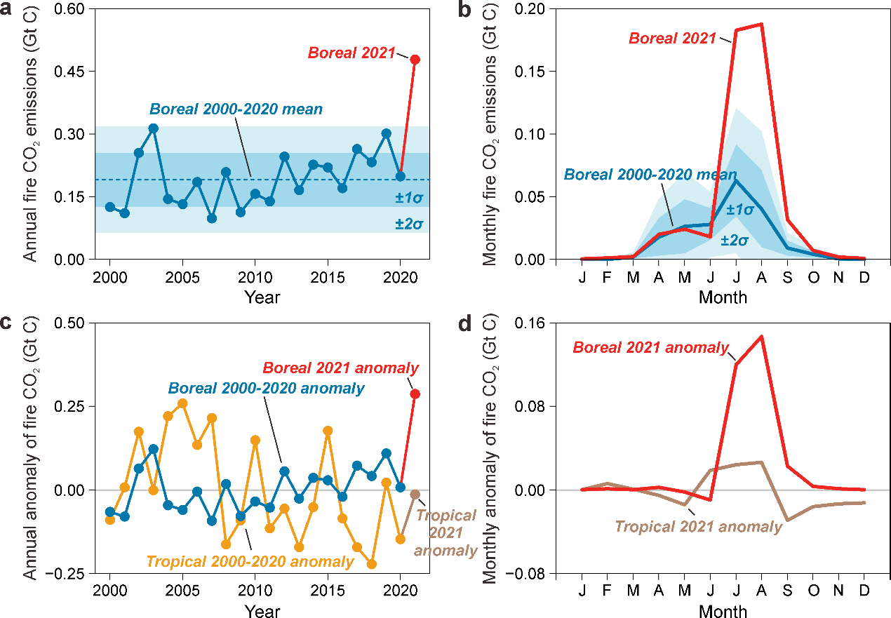北极变暖速率是全球其他区域的两倍以上,气候变暖使植被茂盛生长,高温热浪将“燃料”变得异常干燥,导致北半球中高纬地区的野火发生风险增加。为准确、及时追踪全球野火排放,团队创新性建立了利用一氧化碳卫星遥感数据反演全球野火二氧化碳排放的新方法,基于一氧化碳排放反演数据重构野火燃烧效率的时空动态变化,实现了对野火二氧化碳排放的高精度动态监测。在这一新方法基础上,团队进一步自主研制了全球野火碳排放近实时量化追踪系统,反演量化了2000至2021年野火二氧化碳排放的时空格局,系统解析了北半球中高纬地区野火(以下简称“北方野火”)2021年创历史新高排放背后的驱动因素,揭示了气候变暖-野火排放之间的正反馈机制与潜在未来风险。