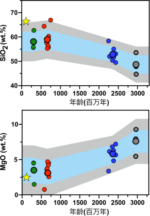 图2.基于冰碛岩V同位素计算得到的SiO2和MgO含量与时间关系图