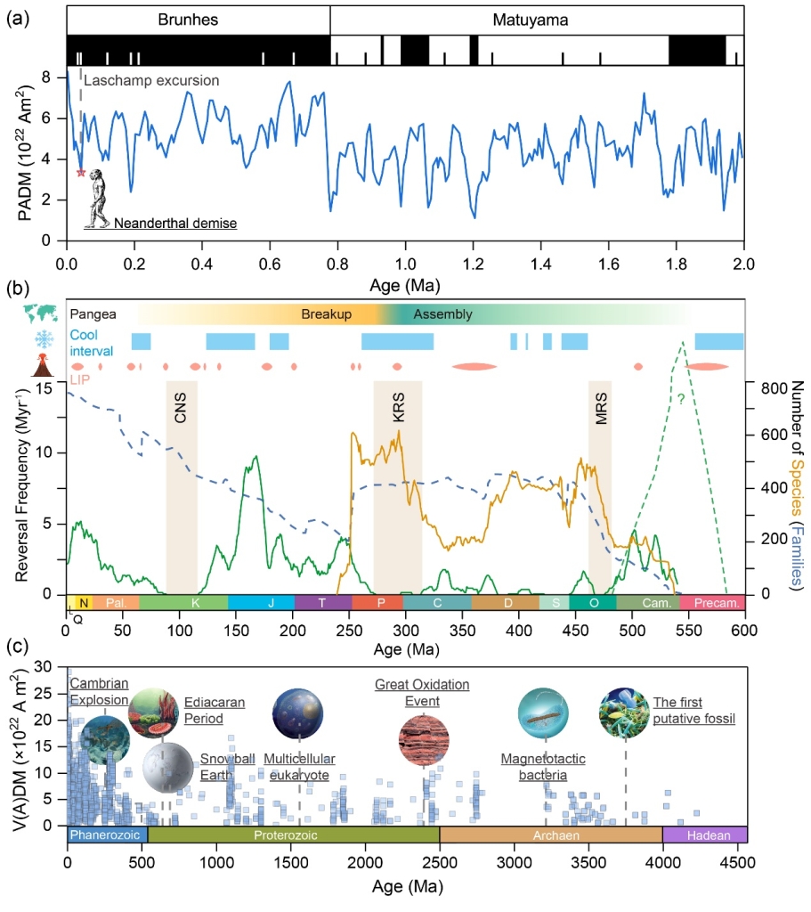 中国科学院地质与地球物理研究所生物地磁学团队潘永信院士和李金华研究员从文献整理了从万年到十亿年尺度上的地磁场极性和强度变化与重大生物演化事件,在此基础上探讨地磁变化对生物的可能作用及机制,并前瞻未来利用多学科交叉、结合实验观测与理论模拟,开展地磁场-生物圈关联研究的重要性与途径。文章认为: