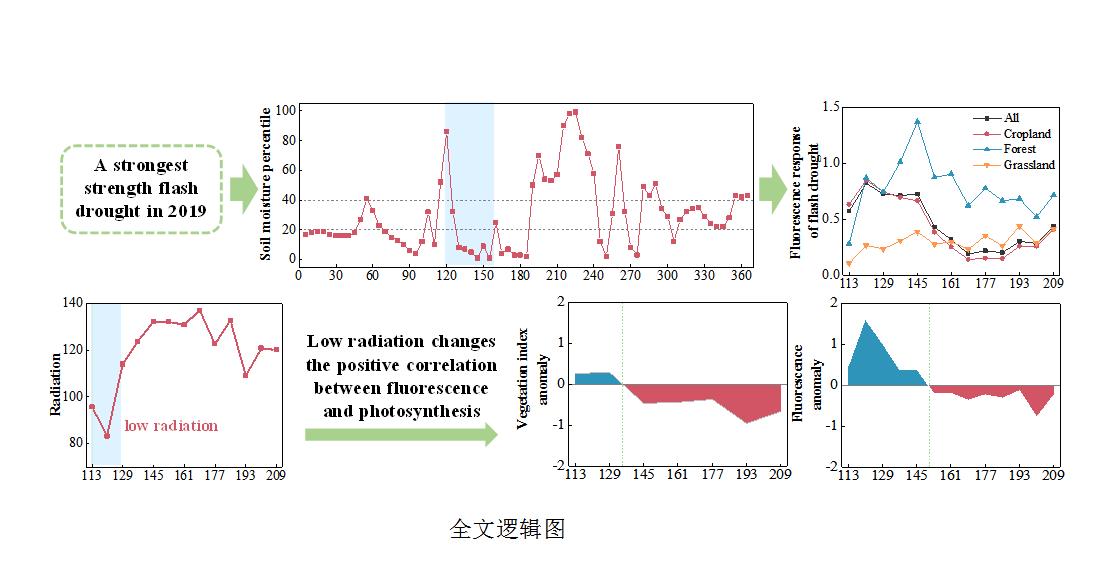 遥感植被指数广泛用于监测干旱对植被的影响, 这些指数对干旱响应具有明显的滞后性。随着遥感技术的发展,星载光谱仪实现了全球的日光诱导叶绿素荧光(SIF)反演。鉴于SIF能快速响应光合的变化, 研究团队联合 SIF和VI,采用自主研发的VIP分布式生态水文模型,探讨了不同植被类型对此次骤旱事件的响应。发现与森林和草地相比,农田的SIF和SIFyield对水分流失和补给更为敏感。低辐射改变了荧光与光合作用之间的线性关系。骤旱造成了40%流域范围的GPP受到损失,最大损失达到0.16 kg C m-2。
