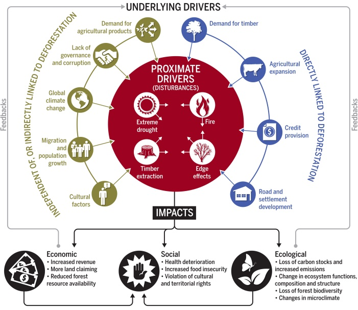 研究认为导致森林退化的四个关键干扰因素为森林火灾、边缘效应(即毗邻已砍伐区域的森林发生的变化)、木材砍伐(如非法砍伐)和极端干旱。不同的森林区域可能会受到其中一个或多个干扰因素的影响。该项研究由35名国际科学家和研究人员主导,是AIMES(地球系统分析、整合和建模)项目的成果。北京师范大学系统科学学院韩战钢教授课题组参与了本项目的研究,为项目提供了系统和整体的研究方法。