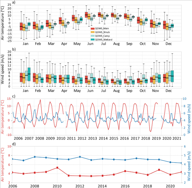 珠峰站建于2005年,位于定日县扎西宗乡绒布河河谷中,距珠峰登山大本营30公里左右。建站十八余年来,珠峰站从一顶帐篷起家,逐渐成为设施完备、仪器齐全的综合观测研究站,并且于2022年成为科技部批准建设的69个国家野外科学观测研究站之一,名称定为“西藏珠穆朗玛特殊大气过程与环境变化国家野外科学观测研究站”。珠峰站地气相互作用综合观测研究平台由六个站点组成(图1),这些站点覆盖了不同类型的下垫面,如高寒戈壁荒漠、高寒草甸、高寒湿地、冰川、裸岩等,配备了大气边界层塔、自动气象站、涡动相关仪、微波辐射计、无线电探空、风廓线仪、FlowCapt风吹雪粒子监测仪、多普勒雷达、孢粉电子采样仪等仪器和设备,以开展大气物理、大气环境、植被生态等观测。团队基于综合观测平台多年观测资料,针对珠峰地区地气相互作用及其局地天气、气候效应开展了一系列的研究,并且在本论文中对气候变化背景下该地区近地层及土壤微气象要素变化特征(图2)、山区特殊地表特征下的陆面过程参数分析、特殊环境大气边界层结构特征所取得的亮点成果进行了系统地凝练总结,为未来更精准、更可靠的遥感反演、数值模拟、天气和气候预报提供科学依据。