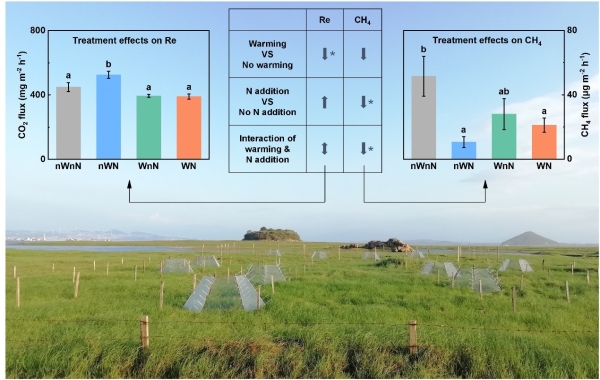 为了探究鄱阳湖湿地碳排放对气候变暖和大气氮沉降的响应,中国科学院南京地理与湖泊研究所徐力刚研究员团队程俊翔博士等人,联合加拿大纽芬兰纪念大学吴江华教授,在鄱阳湖湿地建立了全球变化模拟实验平台(图1),通过开顶箱装置模拟增温、喷施硝酸铵溶液模拟氮沉降,采用静态箱-气相色谱法、线性混合效应模型等技术方法,研究了增温、氮沉降及两者交互作用对生态系统呼吸和CH4通量的影响。
