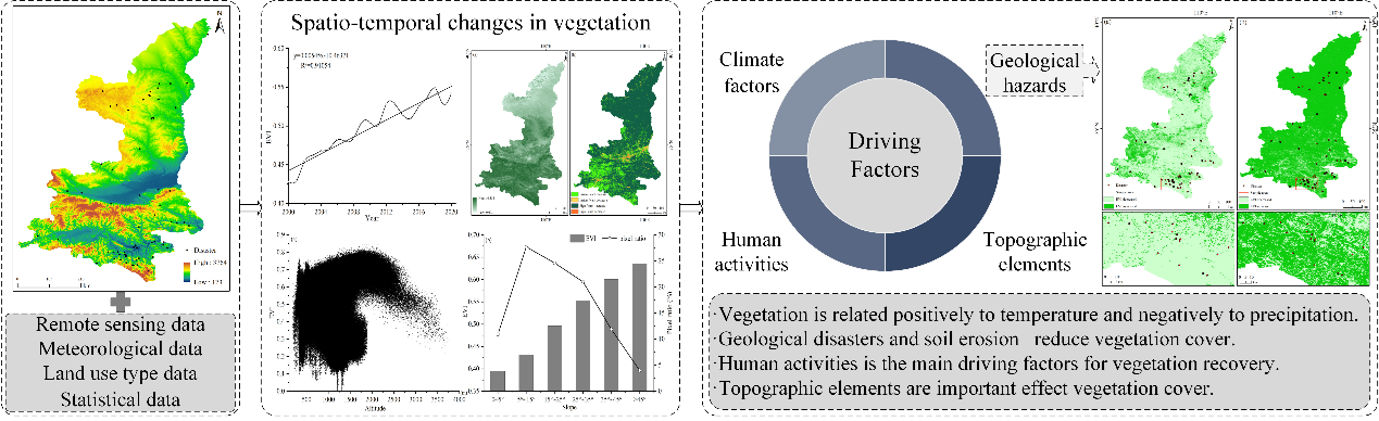 作为陆地生态系统的重要组成部分,植被在连接大气圈、水圈、生物圈和土壤圈方面具有重要功能,论文的具体目标是探讨植被覆盖度对不同因子的响应。本研究基于Modis数据、气候数据、LUCC数据、DEM数据和地质灾害统计数据,分析了陕西省2000-2020年植被覆盖度的时空变化特征,并定量评估了植被对气候因子、土地利用变化、地形因子和地质灾害的响应,研究结果对生态系统监测具有重要意义,为生态系统恢复提供了科学依据。