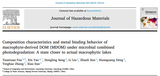 近日,我校球王会体育姚昕教授研究团队在环境科学与生态学领域SCI期刊《危险材料杂志》(Journal of Hazardous Materials)上发表了题为《微生物联合光降解下水生植物源DOM的组成特征和金属结合行为:一种更接近实际草型湖泊的状态》(Composition characteristics and metal binding behavior of macrophyte-derived DOM (MDOM) under microbial combined photodegradation: A state closer to actual macrophytic lakes)的研究性文章。我校2020级研究生樊团团(现为北京师范大学博士生)为论文的第一作者,姚昕教授为本文的通讯作者,球王会体育为第一署名单位。《危险材料杂志》(Journal of Hazardous Materials)是中国科学院JCR分区下环境科学与生态学领域的一区TOP期刊,2023年最新影响因子为13.6。